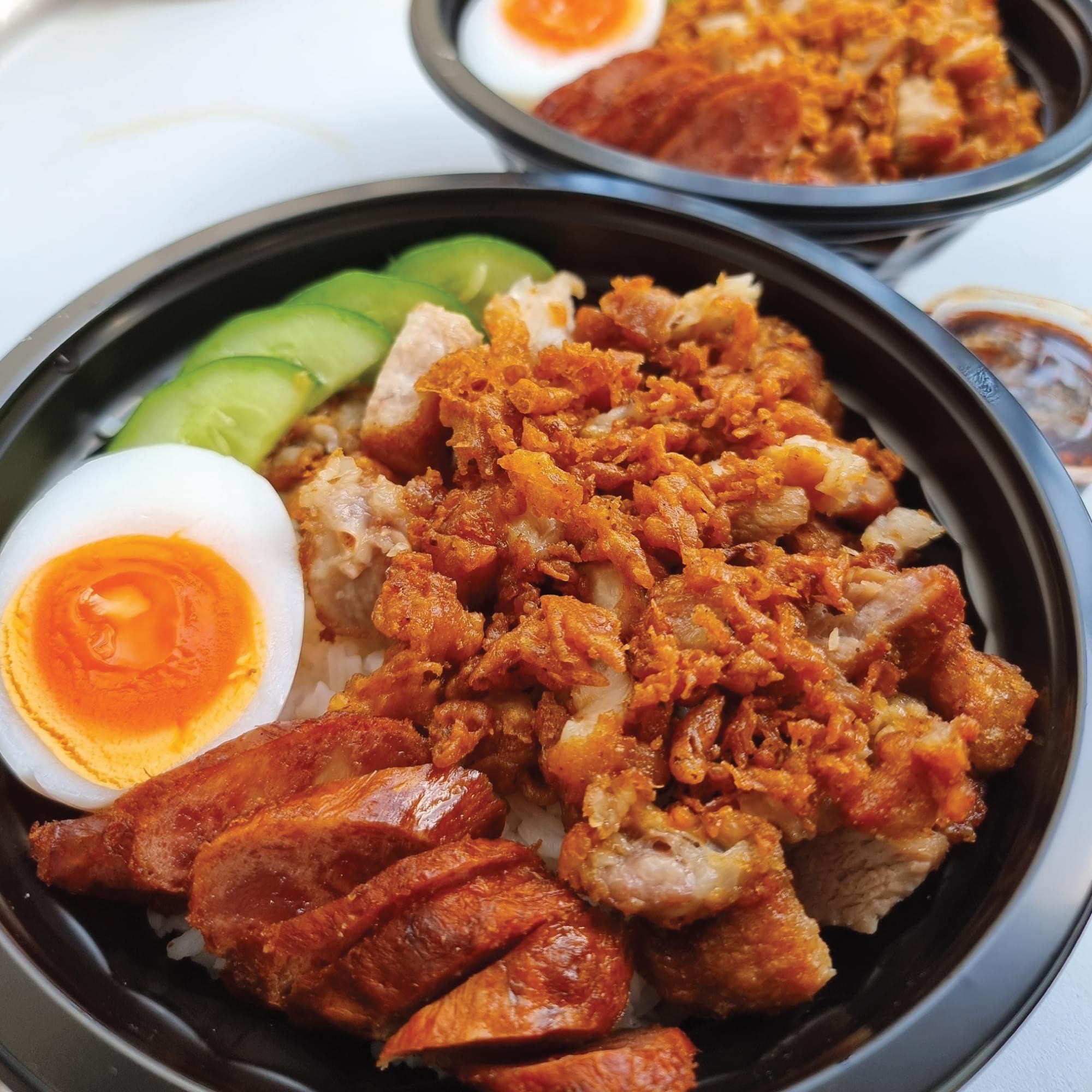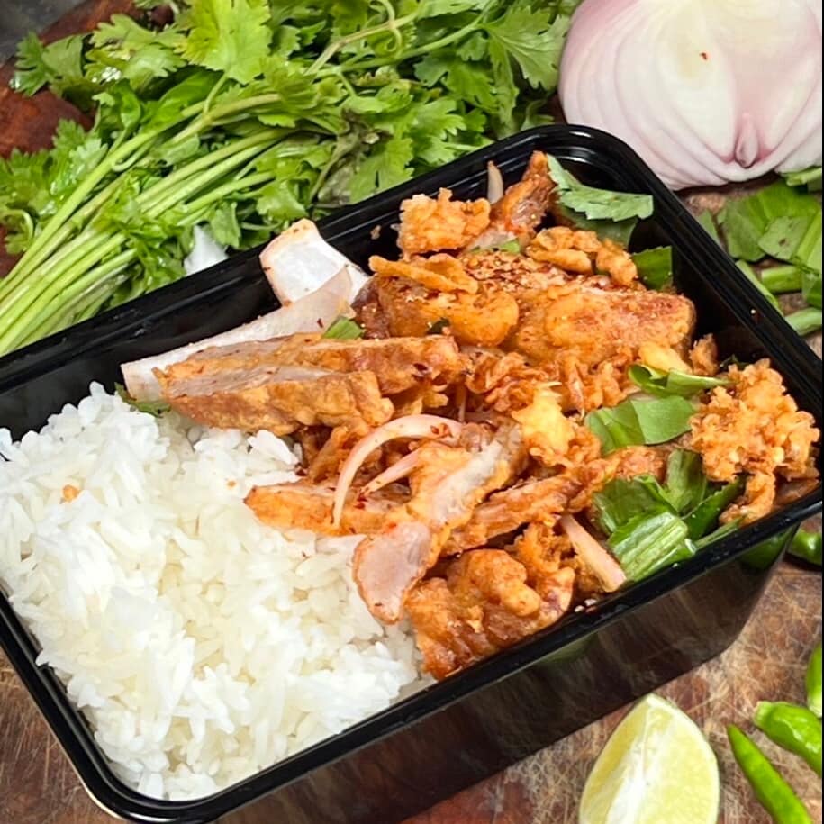 ข้าวหมูทอดแน่นๆเสิร์ฟพร้อมน้ำจิ้ม